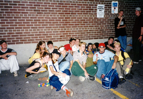 andr3w, Chris {Eleven}, slovo, and fellow ravers out front of The Warehouse, waiting for security to start letting people into the party. The girl in the top left with the yellow pants is the caffine girl! :) |